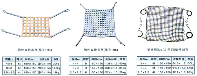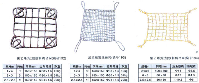 吊網有:吊貨網,尼龍吊網,鋼絲繩吊網,尼龍扁帶吊網,鋼絲吊網,鋼纜吊網,鋼纜吊貨網,鋼絲吊貨網,PP繩吊貨網, 鋼絲繩吊貨網,尼龍繩吊貨網,尼龍繩吊網,吊裝用吊網、防護用吊網,尼龍扁平吊網,扁帶吊網,錦綸帶吊網,錦綸帶吊貨網, 繩索吊網,貨柜網,貨物網,碼頭吊貨網,尼龍吊貨網,編織帶吊網,港口吊網,休閑吊床(吊網),編織繩網,特種吊網,化 纖吊網,尼龍吊裝網,起重吊裝網,聚乙烯(尼龍)絞制繩吊網,尼龍絞制繩吊網,錦綸安全網,錦綸扁帶吊網,尼龍扁帶吊網。
